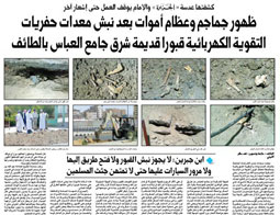 توقف العمل بالحفريات المُحيطة بجامع العباس بالطائف ولكن في جهة واحدة قبل المقابر من الناحية الشرقية فيما لا زال يستمر العمل في الجهات الأخرى بعد أن تم الكشف عن قبور منبوشة بسبب الآليات التي تقوم بأعمال الحفر والتابعة لإحدى المؤسسات التي تتولى زرع كيابل كهربائية بهدف التقوية، كما تم الكشف عن عظام وجماجم ومجموعة من رُفات الأموات كانت متناثرة على الطريق إثر الأعمال وقد تم إبلاغ إمام الجامع والذي طلب توقيف العمل لحين الوصول لفتوى أو توجيه من المحافظة حيال هذه الرُفات والتي اتضح أنها تعود لقبور مدفونة تحت الطُرق المحيطة بالجامع وتحديداً أمام مقبرة الشهداء القديمة والتي تعود لبدايات تأسيس الجامع، فيما أشار أحد العاملين من الوافدين بأن المؤسسة أبلغته عدم إكمال الحفريات فقط إكمال ما تم إنجازه مُسبقاً لحين صدور توجيهات يتم بموجبها تكملة الحفريات وفقاً لما هو مُخطط له.