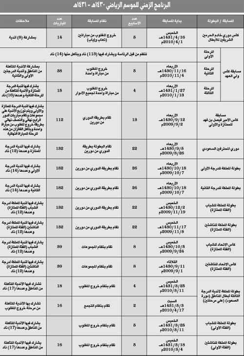 البرنامج الزمني للموسم الرياضي 1430هـ - 1431هـ