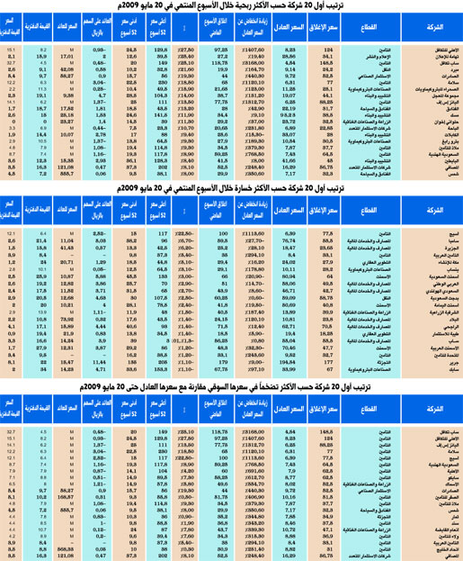 لم تبتعد السوق المالية المحلية كثيراً حسب إغلاقها الأسبوع الماضي (20 مايو 2009م) عن مستوياتها السوقية للأسبوع الأسبق، حيث حافظت على نفس المسافة النسبية تقريباً بينها وبين التقييم العادل لأصولها، إذ ارتفعت بنسبة طفيفة من نحو 18.3 في المائة إلى 18.7 في المائة. وفي ضوئه أظهرت تلك التحركات ارتفاع عدد الشركات المقيمة بأعلى من قيمتها العادلة من نحو 88 شركة بنهاية الأسبوع الأسبق إلى 92 شركة مساهمة، فيما انخفض عدد الشركات المقيمة بأقل من قيمتها العادلة من نحو 39 شركة بنهاية الأسبوع الأسبق إلى 35 شركة مساهمة. أمّا على مستوى القراءة لتحركات الأسعار السوقية للأصول المدرجة فقد تصدرت لائحة الأكثر ارتفاعاً خلال الأسبوع كل من الأهلي للتكافل بنسبة ارتفاع 27.5 في المائة، ثم تهامة للإعلان بنسبة ارتفاع 25.4 في المائة، ثم ساب تكافل بنسبة ارتفاع 25.1 في المائة، ثم مبرد بنسبة ارتفاع 21.6 في المائة، ثم الصادرات بنسبة ارتفاع 19.3 في المائة، ويمكن للقارئ الكريم متابعة بقية التطورات في الجدول رقم (1) المرفق. فيما تصدرت لائحة الأكثر انخفاضاً خلال الأسبوع كل من أسيج بنسبة انخفاض - 22.5 في المائة، ثم مجموعة سامبا المالية بنسبة انخفاض -6.7 في المائة، ثم بنك (الجزيرة) بنسبة انخفاض -6.2 في المائة، ثم التأمين العربية بنسبة انخفاض -5.4 في المائة، ثم مكة للإنشاء بنسبة انخفاض -5.1 في المائة، ويمكن للقارئ الكريم متابعة بقية التغيرات في الأسعار من خلال الاطلاع على الجدول رقم (2) المرفق.