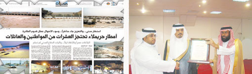 من جهة أخرى تم تقديم الدروع التذكارية والتقديرية لعدد من الجهات الحكومية وهي البلدية والشرطة والدفاع المدني بحريملاء, وكذلك تكريم مجموعة بيت الميناء للأكلات الشعبية لدعمها وتشجيعها ومشاركتها في هذه المناسبة بتقديم عدد من الجوائز التشجيعية للمكرمين. كما تم تكريم الأستاذ عبدالعزيز سليمان الحسين لمشاركته الفعالة. ونالت جريدة (الجزيرة) تكريماً على تغطيتها الإعلامية المتميزة بتقديم درع تذكاري لها. الجدير بالذكر أن محافظة حريملاء شهدت في يوم الخميس الموافق 13 - 4 - 1430هـ أمطاراً غزيرة سالت على إثرها الأودية والشعاب حيث تسبب جريان الأودية في احتجاز عدد من العائلات والمواطنين منذ الساعة الثالثة عصراً وحتى الساعة التاسعة مساءً.