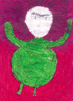 (السلام عليك يا أمنا الغولة) هو ما قاله البطل ليتجنب أن يصبح وجبة عشاء. لترد عليه الغولة: (لولا سلامك سبق كلامك لأكلت لحمك قبل عظامك). رسم: مينا أبوحماد العمر: 13 سنة