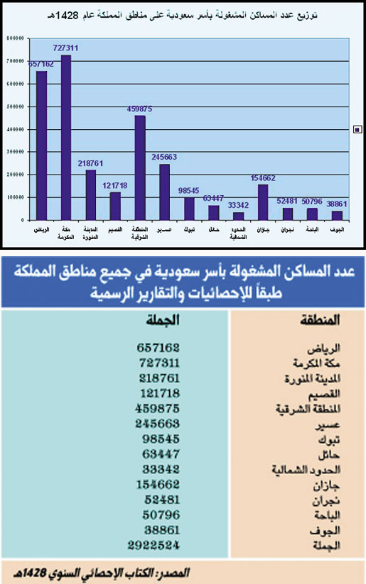 الجدول التالي يبيّن عدد المساكن المشغولة بأسر سعودية، وذلك في جميع مناطق المملكة حيث تتوزع هذه المساكن على المدن حسب عدد السكان بنسب متفاوتة نتيجة لعدد سكان كل منطقة.