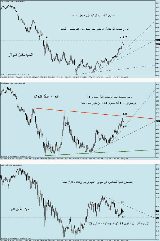 أسدل الستار الأسبوع الفائت على زوال شبح من أشباح مسرحية الإفلاس التي بدأت ببنك ليمان برذرز وغيره من البنوك الأمريكية وصولا إلى شركة جنرال موتورز التي أحزنت الكثير من الموظفين في أمريكا جراء ما قدمته الشركة لسوق العمل والتي كانت في وقت من الأوقات توظف ما نسبته 20% من العاملين في القطاع الخاص الأمريكي كما أن المستثمرين حزنوا أيضا وعبروا عن حزنهم بمجاملة شرائية متواضعة لمؤشر الداو الجونز، وعليه أصبح المؤشر أكثر رشاقة بعد استحواذ الحكومة على ما نسبته60% بعد إجراء حمية قاسية لإزالة بعض الشحوم من الاقتصاد الأمريكي، وبهذا فقدت أسواق الأسهم أخا عزيزا رافقها لعقود طويلة وتداعيات ذلك كانت واضحة جدا من ضعف عزوم عملات العائد المرتفع بعد سباق امتد من شهر مارس الماضي، حيث بدأت عمليات الشراء على الدولار والين تلفت الكثير من مضاربي العملات الأجنبية، ولابد من الإشارة هنا أنه يجب التعامل مع هذا التحول بشكل جدي حتى يثبت العكس والسبب أن حركة الأسعار الرئيسية لا تزال تتمسك باتجاهها الصاعد لكن قوة هذا الاتجاه بدأت تضعف بشكل ملفت للانتباه.