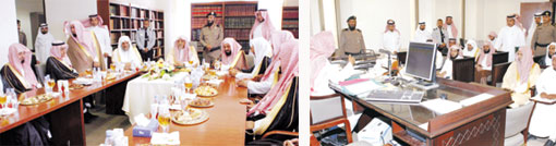 تفقد رئيس المجلس الأعلى للقضاء فضيلة الشيخ الدكتور صالح بن عبدالله بن حميد أمس المحكمة العامة بالرياض حيث كان في استقباله رئيس المحكمة العامة فضيلة الشيخ سليمان المهنا وعدد من أصحاب الفضيلة القضاة. وقد رحب رئيس المحكمة العامة بمعالي رئيس المجلس الأعلى للقضاء وقدم له نبذة عن سير العمل في المحكمة العامة بالرياض. بعدها قام بجولة في المحكمة اطلع خلالها على أقسامها وسير العمل فيها وشاهد أحد المجالس القضائية والمكاتب الإدارية واستمع لشرح مفصل عن آلية سير القضايا. واطلع على مبنى المحكمة المكونة من اثني عشر طابقاً ويتألف من 32 وحدة قضائية و5 جلسات قضاء مشتركة إضافة إلى ديوان رئيس المحكمة ومقر بيت المال وهيئة النظر والمكاتب الإدارية إلى جانب مكتبة وقاعة اجتماعات تتسع لـ 200 شخص كما اطلع على المسجد الذي يتسع لـ 600 مصل إضافة إلى مصلى للنساء ، وشاهد خرائط لمخططات المبنى بأدواره المتعددة كما زار صالات خاصة للنساء.