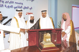 وأعرب عن شكره للقائمين على الدورة وتمنى لهم التوفيق والنجاح.ثم تتالت فقرات الحفل الذي اشتمل على كلمات وقصائد شعرية.وفي نهاية الحفل قام وكيل إمارة منطقة عسير بتوزيع الشهادات وتكريم المتزوجين ثم تسلم وكيل الإمارة درعاً بهذه المناسبة.