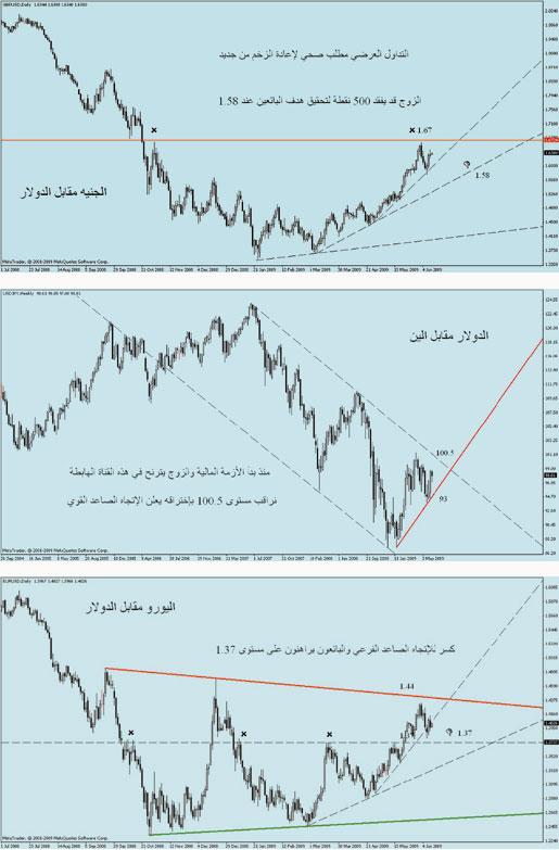 يبدو أن سلوك الحركة السعرية للدولار يتأهب وعلى حين غفلة لامتصاص القوة الشرائية المترددة في أسواق الأسهم الأمريكية، خصوصاً بعد تسجيله مستوى 81 أمام سلة عملاته المقوم بها. أما من حيث الأساسيات فقد ظهر لنا الاسبوع الفائت نتيجة معدل البطالة لشهر مايو والذي وصل إلى ما نسبته 9.4% وهو - بلا أدنى شك - يعتبر مؤشراً أساسياً متأخراً، ولا يفيد في اتخاذ القرارات المستقبلية. أما من حيث مخزونات الجملة لشهر إبريل فقد انخفضت إلى قيمة 1.4 والقراءة السابقة كانت منخفضة إلى مستوى 1.6 مما يشير إلى تحسن في تسويق هذا المخزون. ومن جهة أخرى تم الإعلان عن طلبات القروض العقارية للأسبوع الأول من شهر يونيو حيث تقلص انخفاضها إلى 7.2% مقارنةً بالإعلان السابق المنخفض 16.2% وفي ذلك إشارة إضافية لتحسن قطاع الإسكان، وعندما نجري موازنة ترجيحية لهذه البيانات نجد أنها متأرجحة؛ مما انعكس ذلك على أسواق الأسهم هناك وأسهم في تعزيز الشراء المتدرج في العملة الخضراء التي قد تجلب لها أرقاماً خضراء؛ وذلك لوجود علاقة عكسية بين العملة الأمريكية ومؤشرات أسواق الأسهم فيها.
