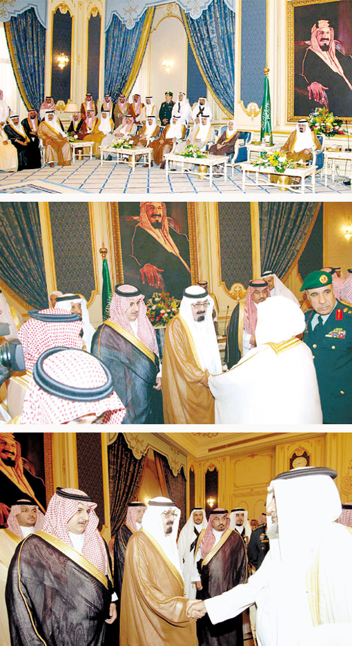 استقبل خادم الحرمين الشريفين الملك عبدالله بن عبدالعزيز آل سعود - حفظه الله - في الديوان الملكي بقصر السلام في جدة أمس أصحاب السمو الملكي الأمراء وأصحاب المعالي الوزراء وكبار موظفي الديوان الملكي وكبار موظفي ديوان رئاسة مجلس الوزراء وكبار المسؤولين وقادة وضباط الحرس الملكي.