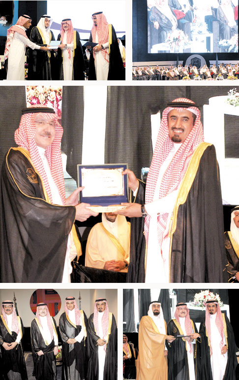 إثر ذلك أعلنت نتائج الخريجين، ثم سلم سموه شهادات الدكتوراه والماجستير ومراتب الشرف.. عقب ذلك تسلم سموه هدية تذكارية من معالي مدير الجامعة.