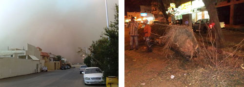تعرضت مدينة بريدة أمس لموجة من الأتربة غطت سماءها ما أدى إلى تدن في مستوى الرؤية الأفقية، حيث ألزمت موجة الغبار عدداً من المواطنين منازلهم نتيجة كثافة الأتربة في الطرقات، كما شهدت مستشفيات بريدة ارتفاعاً في عدد المراجعين وغالبيتهم مصابون بأمراض الصدر والحساسية والربو، وتسبّبت في سقوط الأشجار على بعض السيارات وتضررها، كما تضرر جزء من زنك يستخدم لتغطية سقف وحوش منزل شعبي يقع بحي العليا، حيث تقدّر مساحة الجزء الذي سقط بـ 200 متر تقريباً.