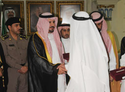 كرَّم صاحب السمو الملكي الأمير فهد بن بدر بن عبدالعزيز أمير منطقة الجوف أمس الأول بقصر سموه الطلاب المتفوقين لجميع المراحل الدراسية.. وبدأ الحفل بالقرآن الكريم، ثم كلمة التربية والتعليم ألقاها مدير عام الإدارة الدكتور فلاح العجرفي رحب فيها بسمو الأمير والحضور الكرام وقال إن هذه الدولة نشأت من على يد مؤسسها الملك عبدالعزيز بالاهتمام بالإنسان معرفياً وثقافياً ونهج على نهجه أبناؤه البررة حتى عهد خادم الحرمين الشريفين والذي تبنى تطوير التعليم في مشروع سنحصد إيجابيته, وأضاف: إننا يا سمو الأمير مقبلون على اختبارات وتكريم أبنائك المتفوقين يعطيهم دفعة لاستمرار تفوقهم وتقديم المزيد.. وشكر المعلمين الذي أخرجوا هؤلاء الطلبة.. كما شكر أولياء أمورهم, بعدها أُلقيت كلمة المتفوقين ألقاها نيابة عنهم الطالب عبد الرحمن الفالح، ثم كرّم سمو الأمير المتفوقين بتسليمهم دروعاً تذكارية ومن ثم قدم العجرفي درعاً تذكارياً لسموه.
