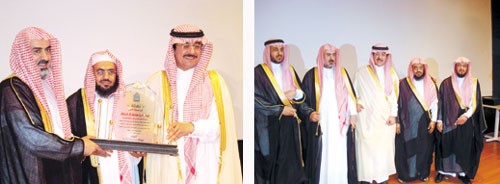بعد ذلك كرم سمو الأمير الطلاب المعلمين والداعمين للمعهد وتسلم سمو الأمير درعاً من يد معالي مدير الجامعة وثم لمدير الجامعة ومدير المعهد بعدها غادر سمو الأمير مقر الحفل.