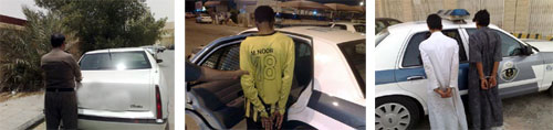 دوريات الأمن بمنطقة الرياض - وبعد تلقيها معلومات البلاغ - أجرت تحرياتها في المنطقة التي تم ارتكاب الحادث ونشر فرقها الميدانية في الأحياء المجاورة للبحث عن الأشخاص على ضوء أوصافهم وأوصاف السيارة التي يستقلونها.. وقد أثمرت هذه الجهود عن العثور على سيارة تنطبق عليها نفس الأوصاف يستقلها ثلاثة أشخاص في العقد الثاني من العمر.