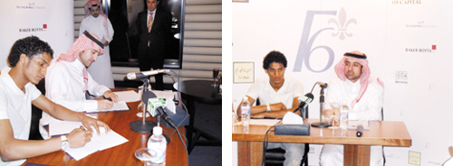 وسط حضور عدد من الشخصيات الرياضية الكبيرة يتقدمها صاحب السمو الملكي الأمير عبد الله بن تركي بن عبد العزيز وعدد كبير من وسائل الإعلام المرئي والمقروء، وقّع نجم الكرة السعودية ونادي الاتحاد الدولي نايف هزازي عقداً مع شركة f6 بحضور رئيس مجلس إدارة الشركة الأمير فيصل بن فهد بن عبد الله آل سعود، هذا وقد تم فور الانتهاء من مراسم التوقيع انطلاق المؤتمر الصحفي الذي كشف خلال الأمير فيصل بن فهد عن العديد من الأمور، والتي جاء في بدايتها أنّ الأسباب الرئيسية وراء اختيار النجم نايف هزازي بين كافة الأسماء الأخرى، وذلك إلى المستويات المتميزة التي قدمها هزازي مع المنتخب الوطني، بالإضافة إلى فريقه الاتحاد ولهذا تم اختياره، مشيراً في الوقت ذاته إلى أنه سيكون هناك عدد من اللاعبين الآخرين الذين سيتم توقيع عقود معهم خلال الفترة المقبلة، موضحاً بأن الشركة لن تكون مخصصة للاعبين في المملكة العربية السعودية فقط، بل ستكون لجميع الدول العربية .. وفي ردة عن تفاصيل العقد المبرم مع هزازي، أوضح سموه بأنّ العقد ينص على أمور دعائية وإعلانية للاعب، بالإضافة إلى بعض الأمور القانونية مؤكداً بأنّ عقد شركة f6 لا يتعارض مع العقود الإعلانية لنايف هزازي مع فريقه الاتحاد، وأضاف سموه بأنه يشكر الرئيس العام لرعاية الشباب الأمير سلطان بن فهد ونائبه الأمير نواف بن فيصل على دعمهم له في المجال الرياضي.
