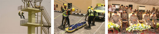 بعد ذلك تم عرض المهارات الفردية الأساسية على أعمال الدفاع المدني ثم أجريت فرضية حادث حريق بمبنى التطبيقات العملية تخللها عملية إنقاذ وإسعاف بعد ذلك تم استعراض تجهيزات الحماية المدنية ومن ثم بدأ العرض العسكري.