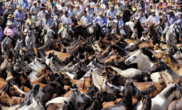 خيول تنقل من محمية طبيعية حيث تعيش طوال العام إلى قرية المونت في جنوب إسبانيا لتباع في المزاد |