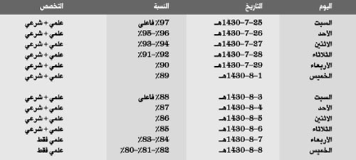 صدرت توجيهات صاحب السمو الملكي نائب رئيس الحرس الوطني للشؤون التنفيذية بفتح باب التسجيل بكلية الملك خالد العسكرية لحملة الثانوية العامة التابعة لوزارة التربية والتعليم لهذا العام 1430هـ اعتباراً من يوم السبت الموافق 25-7-1430هـ وذلك في مقر اللجنة باللواء الخاص جنوب مجمع رئاسة الحرس الوطني بالرياض حسب التخصصات والنسب في الجدول التالي: