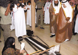 فتاة قصيمية تقوم بعمل النسيج بحضور الأمير فيصل بن بندر وذلك ضمن المعرض المصاحب لملتقى الهيئة الخامس. |