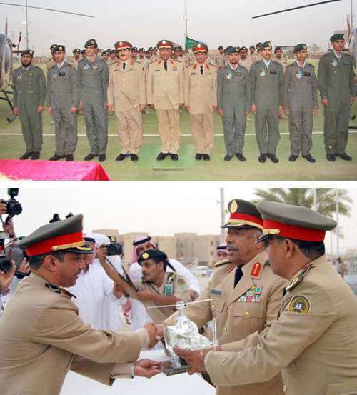 نيابةً عن صاحب السمو الملكي الأمير خالد بن سلطان مساعد وزير الدفاع والطيران والمفتش العام للشئون العسكرية رعى قائد القوات البرية الملكية السعودية الفريق الركن عبد الرحمن بن عبد الله المرشد أمس الأول حفل تخريج دورة الطيران التأسيسية الأولى وعدد من الدورات التي عقدت في العام التدريبي 1430ه وذلك بمعهد طيران القوات البرية بمنطقة القصيم، وفي بداية الحفل ألقى قائد المعهد العميد طيار ركن ناصر العفيف كلمة أوضح فيها أن الدورة بدأت قبل سنة بتشريف من الأمير خالد بن سلطان وبعدد محدود من الطائرات والمدربين ومن الفنيين المؤهلين. وقال انتهت اليوم ولله الحمد بتخريج (7) ضباط طيارين و(14) فنياً مؤهلاً على طائرة التدريب الشوايزر مع وجود (5) مدربين مؤهلين للتدريب على الطائرة وعدد (12) طائرة تدريب شوايزر وعدد (2) مشبة للطائرة. عقب ذلك ألقيت كلمة الخريجين ألقاها نيابة عنهم الرائد الطيار شلاح السالمي، ثم أعلنت النتائج العامة للدورات ووزعت الجوائز والشهادات على الخريجين، تلا ذلك تعليق أجنحة الطيران لضباط الدورة، وفي ختام الحفل سلّم قائد المعهد درعاً تذكارياً بهذه المناسبة لراعي الحفل ثم التقطت الصور التذكارية للخريجين.