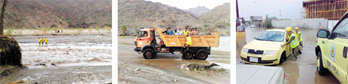 تمكّن رجال الدفاع المدني بمنطقة عسير من إنقاذ عشرة عمال تابعين لإحدى الشركات بعد أن احتجزتهم السيول في موقع عملهم، ووفقاً للناطق الإعلامي بمديرية الدفاع المدني بمنطقة عسير بالنيابة الرائد أحمد آل عواض عسيري فإن بلاغاً ورد إلى مركز القيادة والسيطرة مفاده احتجاز مجموعة من العمال في موقعين بوادي ردوم، وعلى الفور هرعت إلى الموقع الفرق اللازمة وعند الوصول إلى الموقع الأول وجدت مركبة بها عاملون محتجزون داخل السيل وقد تم إنقاذهما رغم شدة اندفاع السيل وحلول الظلام.
