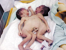 شهد مستشفى محافظة عيون الجواء أمس الأول ولادة توأمين سياميين (سعوديين) عبر إجراء عملية قيصرية قام بها فريق طبي بمشاركة استشاري من مستشفى الولادة والأطفال في بريدة. وقد توفي التوأمان بعد الولادة مباشرة. وفي حديث لوالد الطفلين سعود منصور قال: إن الأم كانت قد لاحظت ثقل الحمل على غير ما هو معتاد، إلا أنها لم تكن تعلم بأن الحمل بتوأم، ونحمد الله سبحانه وتعالى على سلامة الأم فهي الآن بصحة وعافية بعد إجراء العملية القيصرية التي أُجريت لها واستغرقت وقتاً طويلاً.