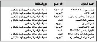 أعلنت وزارة التجارة والصناعة عن تلوث بعض منتجات الكحل المعروض في الأسواق بنسبة عالية من البكتيريا تفوق الحد المسموح به، وذلك وفاق ما أثبتته التحاليل بالإضافة إلى احتوائها على نسبة عالية من مادة الرصاص بأضعاف النسبة المسموح بها في المواصفة القياسية السعودية لمستحضرات التجميل.. وعممت الوزارة على جميع فروعها بالمناطق لسحب ومصادرة النوعيات المخالفة من ذلك الكحل في أسواق المملكة واتخاذ الإجراءات النظامية تجاه مصنعي ومستوردي تلك النوعيات. وشملت المنتجات..