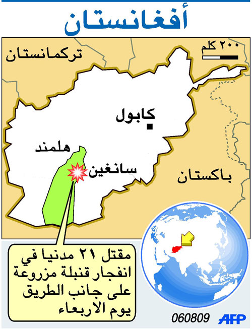 أعلنت وزارة الدفاع الأفغانية أن 21 مدنيا قتلوا وأصيب ستة بجروح الأربعاء في انفجار قنبلة لدى مرور عربتهم في جنوب افغانستان. وقال المتحدث باسم الوزارة الجنرال محمد عظيمي أن الانفجار وقع في سانغين في ولاية هلمند وهي من الولايات الأخطر والأكثر اضطرابا في البلاد. وأضاف إن (القنبلة