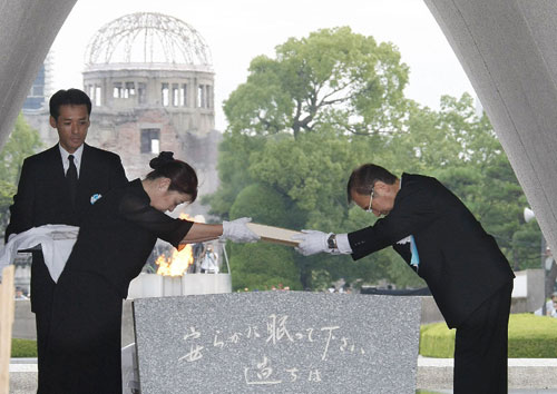 وذكر رئيس البلدية بتصريحات أوباما الذي أكد بأن الولايات المتحدة كونها الدولة النووية الوحيدة التي استخدمت هذا السلاح (تتحمل المسؤولية الأخلاقية للتحرك (من أجل عالم خال من الأسلحة النووية). وقال اكيبا إن (التخلص من الأسلحة النووية ليس فقط رغبة الناجين من القنبلة الذرية بل أيضاً معظم شعوب وأمم العالم). وأضاف (إننا الغالبية العظمى في العالم ندعم مواقف أوباما وندعو باقي العالم إلى الانضمام إلينا للقضاء على كافة الأسلحة النووية بحلول2020). وفي الساعة 8،15 23،15(تغ) عندما انفجرت أول قنبلة ذرية في التاريخ فوق المدينة وقف المشاركون في الحفل وصلوا بصمت في ذكرى عشرات آلاف الضحايا من نساء وأطفال ورجال ومسنين الذين قُتلوا من جراء قوة الانفجار أو اصيبوا بحروق خطيرة أو بالإشعاعات.