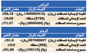 سجل المؤشر العقاري الأسبوعي الصادر عن الإدارة العامة للحاسب الآلي بوزارة العدل لكتابتي العدل الأولى بالرياض والدمام للفترة من يوم السبت 10-8-1430هـ، حتى يوم الأربعاء 14- 8-1430هـ، انخفاضاً في قيمة الصفقات في كتابة العدل الأولى بالرياض نسبته 25.12%، حيث بلغ إجمالي