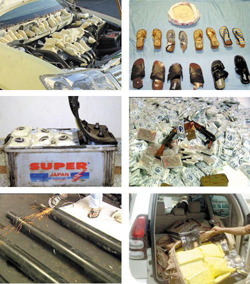 2 - (4.567) أربعة كيلو جرامات وخمسمائة وسبعة وستون جراماً من الهيروين النقي الذي يتم خلطه بمواد أخرى لتتضاعف كميته السوقية إلى (عشرة أضعاف) منها (3.749) ثلاثة كيلو جرامات وسبعمائة وتسعة وأربعون جراماً تم ضبطها مخفية داخل أحذية أحد الوافدين إلى المملكة عبر مطار الملك عبدالعزيز الدولي، و(818) ثمانمائة وثمانية عشر جراماً تم ضبطها مخفية داخل أحشاء مهربها.