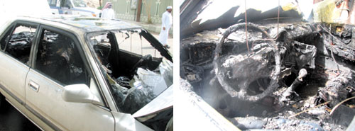 كما باشرت الحادثة الدوريات الأمنية التي ألقت القبض على السيدة، وكذلك الهلال الأحمر، وتبين أن السيدة أتت إلى مكان الحادثة سيرا لعدة كيلومترات حاملة معها كمية البنزين المستخدم وفأسا.