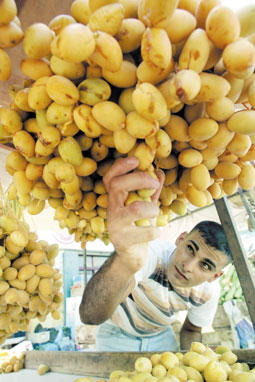 بائع فاكهة فلسطيني في مدينة جنين يستعد لاستقبال زبائن التمر والبلح في أول أيام شهر رمضان المبارك الذي يتزايد عليهما الطلب في مثل هذه الأوقات من كل سنة. |