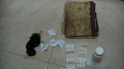 وقد تم العثور معه على أوراق تحتوي على طلاسم سحرية عبارة عن كلمات غير مفهومة وأرقام داخل كيس بالإضافة إلى أعشاب متنوعة، كما ضبط بحوزته مبلغا من المال وجهاز جوال كان هو وسيلة التواصل بين الساحر والسمسار ولتنسيق المواعيد مع الزبائن.
