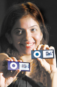 طالبة جامعية هندية تعرض جهاز (اي بود نانو) للموسيقى خلال إطلاقه في مدينة بومباي العام الماضي. ويحرص الشباب والشابات في الهند على اقتناء هذا الجهاز للاستماع للأغاني الهندية بعد إنزالها بواسطة جهاز الكمبيوتر من شبكة الإنترنت مجاناً. وقد بدأت الحكومة الهندية النظر في اتخاذ إجراءات أكثر صرامة ضد منتهكي قوانين الملكية الفردية مما سيزيد من صعوبة الحصول على الأغاني المجانية. (الفرنسية)
