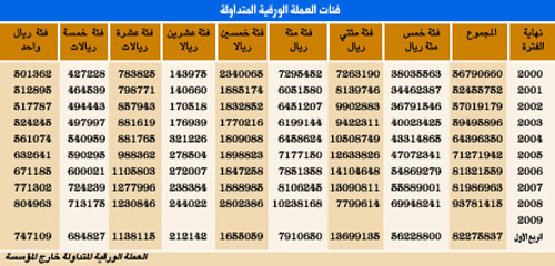 كما أظهرت بيانات المؤسسة انخفاض اعداد كافة الفئات الورقية في الربع الاول من العام الحالي مقارنة بنهاية العام 2008 باستثناء فئة المئتي ريال والتي اظهرت ارتفاعا وصل إلى 68 مليوناً مقارنة بنحو 39 مليوناً فيما وصلت فئة العشرين الحد الأدنى بـ11 مليوناً في الربع الاول من العام الحالي محتفظة بانخفاضها الاقل من بين الفئات في نهاية العام 2008 بنحو 12 مليوناً.