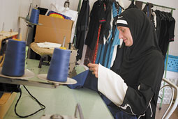امرأة تقوم بخياطة أحد الأزياء الإسلامية في أحد الأحياء وسط فرنسا.