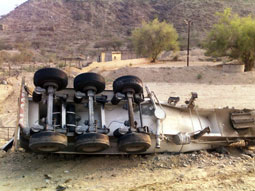 تعرضت (خلاطة) اسمنت لانقلاب في منحدر عميق على طريق العرضية الشمالية - المخواة إثر انحرافها وفقدان سائقها السيطرة عليها. وقد تعرض سائقها لإصابات خفيفة وقد لحق بمقصورتها تلفيات متفرقة، فيما باشرت الجهات الأمنية موقع الحادث.