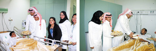 وفي هذا الصدد قام المدير المناوب الأستاذ فيصل بن عميرة وعدد من الأطباء والطبيبات بجولات معايدة صباح يوم أمس الأول على المرضى المنومين في غرفهم وقدم لهم الهدايا والحلويات بمناسبة العيد السعيد، وقد لقيت مبادرة مستشفى عبيد التي يتم تنظيمها سنوياً رضا واستحسان جميع المرضى.