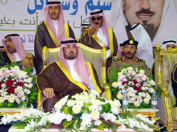 وقد كان في استقبال سموه عند وصوله مقر المعارض بنادي الأخدود وكيل إمارة منطقة نجران المساعد عبد الله بن دليم القحطاني ومدير شرطة منطقة نجران اللواء سعيد بن شايع آل حماد وأمين عام مجلس المنطقة المشرف العام على احتفالات منطقة نجران باليوم الوطني زياد بن محمد بن غضيف. وفور وصول سموه قام بقص الشريط إيذانا بانطلاق فعاليات نجران بمناسبة اليوم الوطني للمملكة وقد تشرف طفلان بتقديم باقتي ورد لسموه ثم تجول في أرجاء المعارض واطلع على الجناح الأول للمؤسس الملك عبد العزيز بن عبد الرحمن آل سعود - طيب الله - ثراه ثم تجول في جناح الملوك منذ عهد الملك سعود وحتى عهد الملك فهد -رحمهم الله التي تتكلم عن مسيرة التنمية في تلك العهود الزاهرة ثم اطلع على جناح يتحدث عن خادم الحرمين الشريفين الملك عبدالله بن عبدالعزيز- حفظه الله- وما وصلت إليه المملكة في عهده الزاهر.