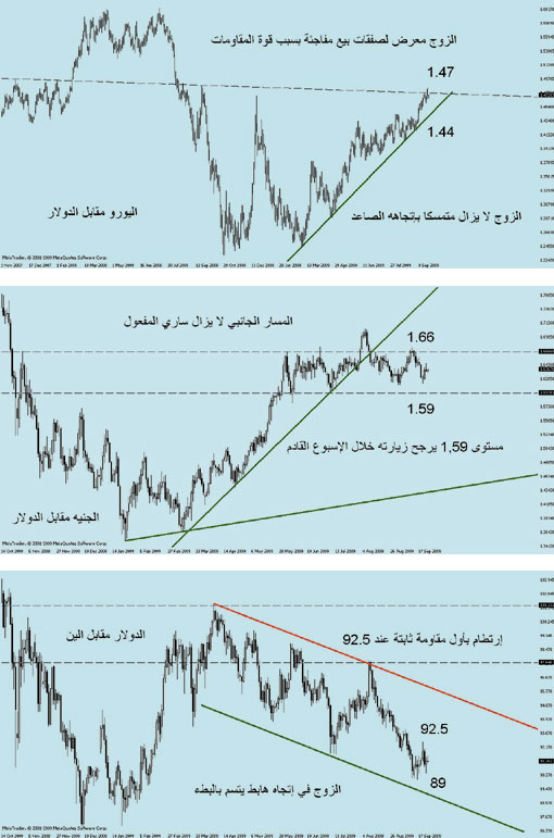 جرى الحديث في التقرير السابق عن التحول اللافت في سلوك شهية المخاطرة، لكن الجديد هذا الأسبوع هو أن الذهب يعاني من صعوبة في تجاوز مستوى 1024 مما سمح للدولار بالتنفس قليلاً، وحافظ على الأقل على قاعه الأسبوع الماضي، لكن ماذا حدث ؟ فقدت أسواق الأسهم جزءاً من شهيتها خصوصاً الأسهم الأمريكية وخفف اليورو من سرعة الرالي الذي إنطلق مع شهر سبتمبر الحالي وعاد الدولار قوياً أمام عملات العائد المنخفض كالين مثلاً وساد الهدوء أسواق النفط على الرغم من ندرة البيانات الإقتصادية إلا أن الحالة العامة للأسواق تشير إلى إنخفاض ملحوظ في شهية المخاطرة والترهل هو أبرز الأعراض وبنظرة سريعة لأحجام التداول لمؤشرات أسواق الأسهم الأمريكية يتضح بأن لا وجود للإنسجام بينها وبين الأسعار المتلاحقة يوماً بعد يوماً وبحاجة لتصحيح يعيد الشهية من جديد حتى تنعم أسواق العملات بزخم أعلى مشابه لمستويات مارس الماضي.