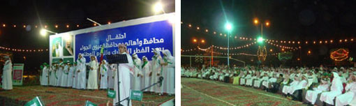 رعى محافظ عيون الجواء محمد بن عبد الله بن حجاج الحفل الذي نظمه أهالي محافظة عيون الجواء احتفالاً بعيد الفطر وذكرى اليوم الوطني، وقد انطلقت الاحتفالات في التاسعة من مساء يوم أمس الأول بآيات من الذكر الحكيم، تلا ذلك كلمة لمحافظ عيون الجواء رحب فيها بالحضور وبيّن أن هذه الاحتفالية تقام لمناسبتين عزيزتين على قلوبنا جميعا أولها عيد الفطر المبارك الذي امتن الله به علينا بعد صيام شهر رمضان وثانيهما ذكري اليوم الوطني المجيد لمملكتنا الغالية الذي يذكرنا ببدايات تأسيس المملكة على يد القائد المؤسس الملك عبدالعزيز رحمه الله والنقلات الكبيرة في التقدم والتطور والرقي إلى وقتنا الحالي في العهد الزاهر عهد خادم الحرمين الشريفين حفظه الله.