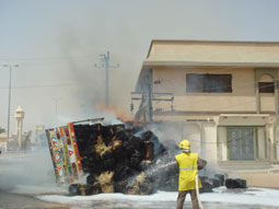 استيقظت إحدى العوائل صباح أمس على دوي ارتطام شديد بمنزلهم الواقع بحي الشرفاء على طريق وادي الدواسر - الرياض السريع، مع تصاعد ألسنة من اللهب في أحد أركان المنزل من الخارج ليهبوا بالخروج ويفاجؤوا بشاحنة من نوع تريلا محملة بأعلاف الذرة، قد ارتطمت بعامود كهرباء ضغط عال وسقوطه على المنزل، مع نشوب حريق كبير في الشاحنة وحمولتها، عندها باشر رجال الدفاع المدني موقع الحادث، وتم فصل الكهرباء ورفع الشاحنة وحمولتها، وتنظيف الطريق بواسطة 3 شيولات تابعة لإحدى الشركات الوطنية، كما أدى الحادث إلى انقطاع الكهرباء بعدد من أحياء وادي الدواسر لعدة ساعات، وما زالت فرق الدفاع المدني تعمل على إخماد الحريق، وفرق الشركة السعودية للكهرباء تعمل على إعادة إيصال التيار الكهربائي حتى إعداد هذا الخبر بعد ظهر أمس السبت، فيما توقفت حركة السير على طريق الرياض - وادي الدواسر - عسير لحين وصول مرور وادي الدواسر، حيث تم تحويل حركة السير حتى تم رفع الشاحنة وحمولتها من الطريق، رب الأسرة قام بإخلاء أسرته المرعوبة من قوة الارتطام إلى مزرعته حتى يزول الخطر، كما تم نقل قائد الشاحنة ومرافقيه من عمال التحميل للمستشفى لتلقي العلاج، فيما لا تزال الجهات الأمنية تبحث في أسباب الحادث.
