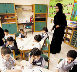 أطفال يجلسون في أحد الصفوف في اليوم الأول لبدء الدراسة في المدارس العامة في دبي في ظل غياب العديد من زملائهم بسبب إنفلونزا الخنازير. |