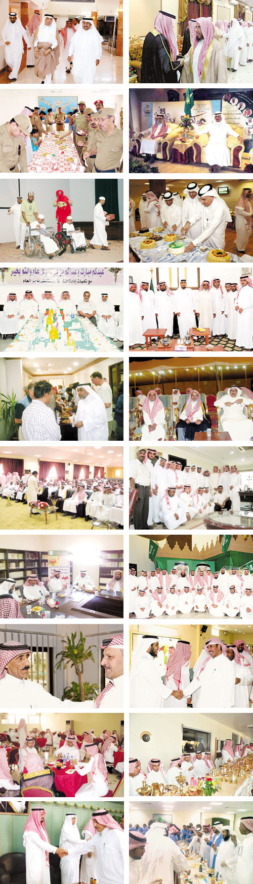 كما أقام برنامج الخدمات الصحية بالهيئة الملكية بالجبيل حفل معايدة لمنسوبي البرنامج بحضور نائب المدير العام للخدمات العامة بالهيئة أحمد العامر ومدير برنامج الخدمات الصحية سليمان الجاسر،كما أقامت بلدية القريات حفل استقبال بمناسبة العيد حضره رئيسها المهندس فايز الشهيلي، وعلى شرف مدير مستشفى محافظة الدوادمي العام سعد اليحيى وبحضور مساعده مرزوق الدلبحي أقام المستشفى حفل معايدة لمنسوبيه، وبحضور رئيس مركز الجنيفي بسدير سعود السلوم احتفل المركز بعيد الفطر المبارك وسط أجواء من الفرح والسرور، كما أقامت بلدية القويعية حفل معايدة لمنسوبيها بحضور رئيس البلدية فهد الحربي ونائب الرئيس عبدالعزيز البصري ومديري الأقسام، وفي الفوارة أقامت لجنة التنمية الاجتماعية حفل معايدة لرؤساء ومنسوبي الدوائر الحكومية بحضور رئيس المركز سالم بن نحيت، وفي الجوف أقام مجلس التدريب التقني والمهني والكلية التقنية حفل معايدة بحضور رئيس المجلس الدكتور دخيل الله الشمدين وعميد الكلية جمال المطلق ووكلاء الكلية، وفي حفر الباطن نظمت كلية المجتمع حفل معايدة لمنسوبيها بحضور عميد الكلية الدكتور حمزة مغربي وجميع رؤساء الأقسام، وأقامت بلدية طبرجل حفل معايدة لمنسوبيها وذلك في صالات الاحتفالات والمناسبات الخاصة في البلدية، وأقامت دائرة التحقيق والادعاء العام بمحافظة المذنب معايدة لمنسوبيها ترأسه رئيس الدائرة عيد الحربي، كما أقامت الجمعية الخيرية لتحفيظ القرآن الكريم بمحافظة دومة الجندل بمنطقة الجوف حفل معايدة داخل سجن المحافظة، وأقام قسم العلاقات العامة بكلية العلوم الطبية التطبيقية بالمجمعة حفل معايدة حضره عميد الكلية الدكتور محمد السبيل، ونظمت بلدية محافظة حفر الباطن حفل معايدة لمنسوبيها حضره رئيس البلدية محمد الشايع، كما أقام ميناء الجبيل التجاري حفل معايدة لمنسوبيه بحضور مدير عام الميناء الكابتن فهد العامر، كما أقام المكتب التعاوني للدعوة والإرشاد وتوعية الجاليات بالفوارة حفل معايدة، وبحضور رئيسات الأقسام النسائية ومديرات الوحدات أقامت إدارة تعليم البنات بعنيزة الأقسام النسائية حفل معايدة بمناسبة عيد الفطر المبارك.