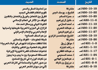 اعتمد الدكتور راشد المبارك جدول ندوته الأحدية التي ستبدأ مساء الأحد القادم بأحاديث مفتوحة عن السفر والسمر خلال فترة الصيف الماضي.