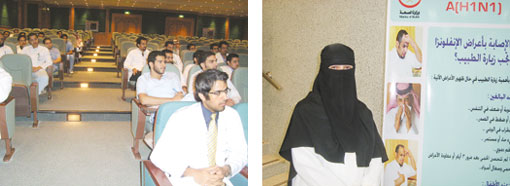 وأشارت إلى أن البرنامج يحاضر فيه نخبة من الأطباء السعوديين المتخصصين من القطاعات الصحية بالمملكة ويعقد لمدة يوم واحد وبشكل مكثف. من جهة أخرى أكملت وزارة الصحة أمس الأول تدريب 600 طبيب بالصحة المدرسية بمختلف مناطق المملكة على التوعية الصحية لمرض إنفلونزا الخنازير (إتش1 إن1) والاكتشاف المبكر للمرض والترصد الوبائي وطرق الإبلاغ ومكافحة العدوى، وذلك في ست مدن رئيسية هي الرياض وجدة والخبر والمدينة المنورة وأبها وبريدة في إطار الخطة التنسيقية للوزارات الأربع (الصحة والتربية والتعليم والثقافة والإعلام والتعليم العالي).