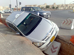 نجا قائد سيارة ليموزين أثناء سقوطها بإحدى الحفريات الواقعة على امتداد تقاطع شارع الملك عبدالله العام مع أحد شوارع الفرعية حيث تمتد الحفرية على امتداد الشارع منذ أكثر من ثلاث أشهر ولم يتم الانتهاء منها حتى الآن مما اضطر رجال الأمن إلى الاستعانة برافعة كبيرة لانتشال سيارته التي تعرضت لأضرار.