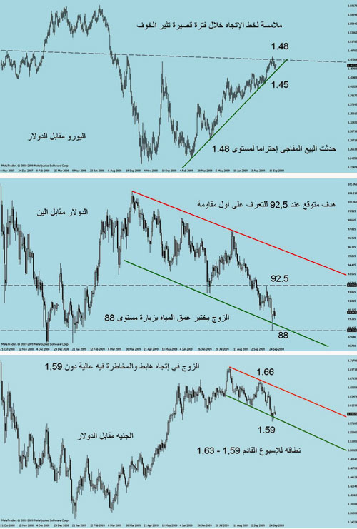 البيانات الاقتصادية والتي تخدم التحليل الأساسي جاءت هذا الأسبوع متباينة ولا تحمل أهمية كبيرة توازي ما ينتظره المستثمرون من نتائج كبرى الشركات العالمية، ونبدأ بطلبات الإعانة لثالث أسبوع من شهر سبتمبر والتي بلغت 530 ألف طلب مقارنة بالرقم السابق عند 545 ألف طلب وتدل على تحسن أسبوعي بشكل متوال وهي مؤشر متقدم لأرقام سوق العمل (معدل البطالة) ويبدو أنها تبشر بقاع أخير لها. أما قطاع الإسكان ظهرت لشهر أغسطس مبيعات المنازل الجديدة منخفضة إلى 429 ألفا مقارنة بمبيعات الشهر السابق 433 ألفا أما القائمة تراجعت بنسبة 2.7% دليل رغبة بائعي الوحدات في تخفيض الأسعار لجلب أكبر قدر ممكن من المشترين لكن يدل هذا التصرف على ترهل السوق بعض الشيء، أما بشأن أسواق النفط فقد أظهر تقرير وكالة الطاقة الأمريكية مع نهاية الأسبوع ارتفاعا في المخزون 2.8 مليون برميل بنفس المقدار للأسبوع الماضي مما يعكس تماسكا سعريا لمتوسط أسعار خامات النفط بين 65 و70 دولار للبرميل في بضعة أيام وواضح بشدة ترقب المضاربين في أسواق السلع لنتائج أداء الشركات الصناعية فهي تمثل استراحة لهم. أما بخصوص السلع جاءت المعمرة منها برقم جديد منخفض لشهر أغسطس 2.4% مقارنة بارتفاع 4.9% للشهر السابق يوحي بتركز اهتمام المستهلكين على شراء السلع الاستهلاكية ذات العمر الإنتاجي القصير يثبت ذلك انخفاض ثقة المستهلك لشهر سبتمبر ليصل إلى 53.1 عن الرقم السابق 54.1، وملخص تداعيات هذا التباين على الدولار تم ترجمته باستقرار يميل لعكس الاتجاه الهابط.