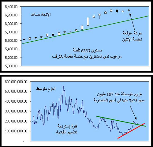 جلسة اليوم الاثنين تفتتح معها الأسواق المالية العالمية وتبدأ التأثيرات التي أبرزها خامات النفط حيث يرجح مع بقاء الدولار عند 77 أمام سلة عملاته أن لا نرى تقلبات حادة في الأسعار فقط قد تمتد من 69 إلى 71 دولاراً، أما العامل الأهم هو أن المستثمرين لديهم معضلة حول موقف قيمة الشهرة لوحدة البلاستك المبتكرة لسابك من نتائج الموسم الثالث أما الانتقائية في التعاملات يرجح استمرارها مع هدوء لقطاع المصارف بالقرب من مستوى 17500 نقطة أيضا 1940 نقطة لقطاع الاتصالات والحاسم في دحر هذه المقاومات هو نتيجة الأداء المالي لها، وبربط هذه العوامل مع دمج حركة التداول لآخر 6 جلسات يرجح أن تكون الجلسة من نصيب المشترين وبإغلاق قريب من 6322 نقطة وفيها استمرار للاتجاه الصاعد بعزوم متوسطة لأحجام التداول قد نلامس فيها مستوى 200 مليون سهم.