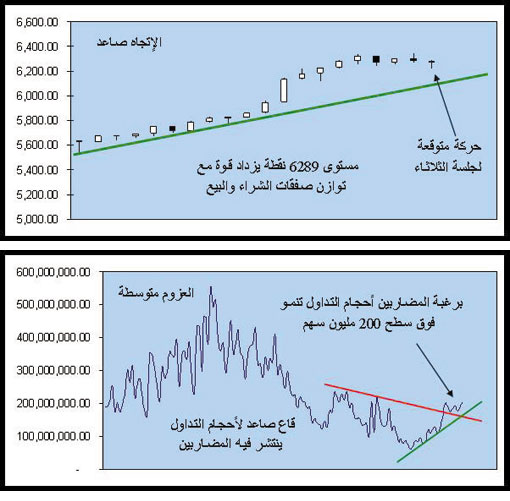 صخب التوقعات التي يتعرض لها السوق أصابته بنوع من التشتت مما أجبره على السير جانبا في آخر 5 جلسات، ومع ندرة الأخبار المؤكدة عن سوق الأسهم وأهمية الربع الثالث أكثر من أي عام مضى أجبر المستثمرين مبكرا على إعادة ترتيب سلتهم الاستثمارية للشركات التي لديهم القدرة على حسم توقعاتهم فيها، ومع انشغالهم غالبا ما يتشجع المضاربون على إحداث زخم في الصفقات تمخض عن ذلك ارتفاع لأحجام التداول إلى 201 مليون سهم بعد حدوث جني خفيف للأرباح الرأسمالية في الأسهم القيادية خصوصا المصارف والبتروكيماويات حيث الأول يميل لزيارة 16922 نقطة والآخر يفضل التريث فوق 5088 نقطة، كل ذلك ساهم في عدم قدرة السوق على الإغلاق فوق 6289 نقطة لكن ذلك لا يخيف كثيرا فهي عملية تمشيط للمنطقة حيث الاتجاه لا يزال صاعدا لكنه بطيء في حركته أما العزوم فهي متوسطة، ويبقى الأهم من ذلك أن فترة إعلانات الشركات تظل مرحلة تتسم بالسلوك الحاد.