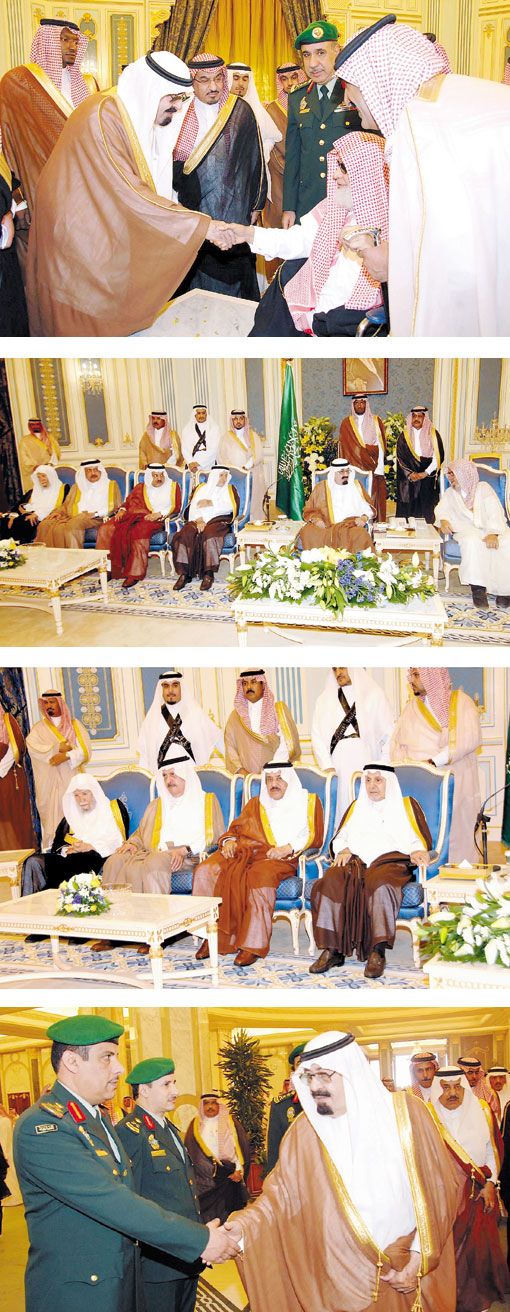 استقبل خادم الحرمين الشريفين الملك عبدالله بن عبدالعزيز آل سعود -حفظه الله- في الديوان الملكي بقصر اليمامة أمس أصحاب السمو الملكي الأمراء وأصحاب المعالي الوزراء وكبار موظفي الديوان الملكي وكبار موظفي ديوان رئاسة مجلس الوزراء وكبار المسئولين وقادة وضباط الحرس الملكي.